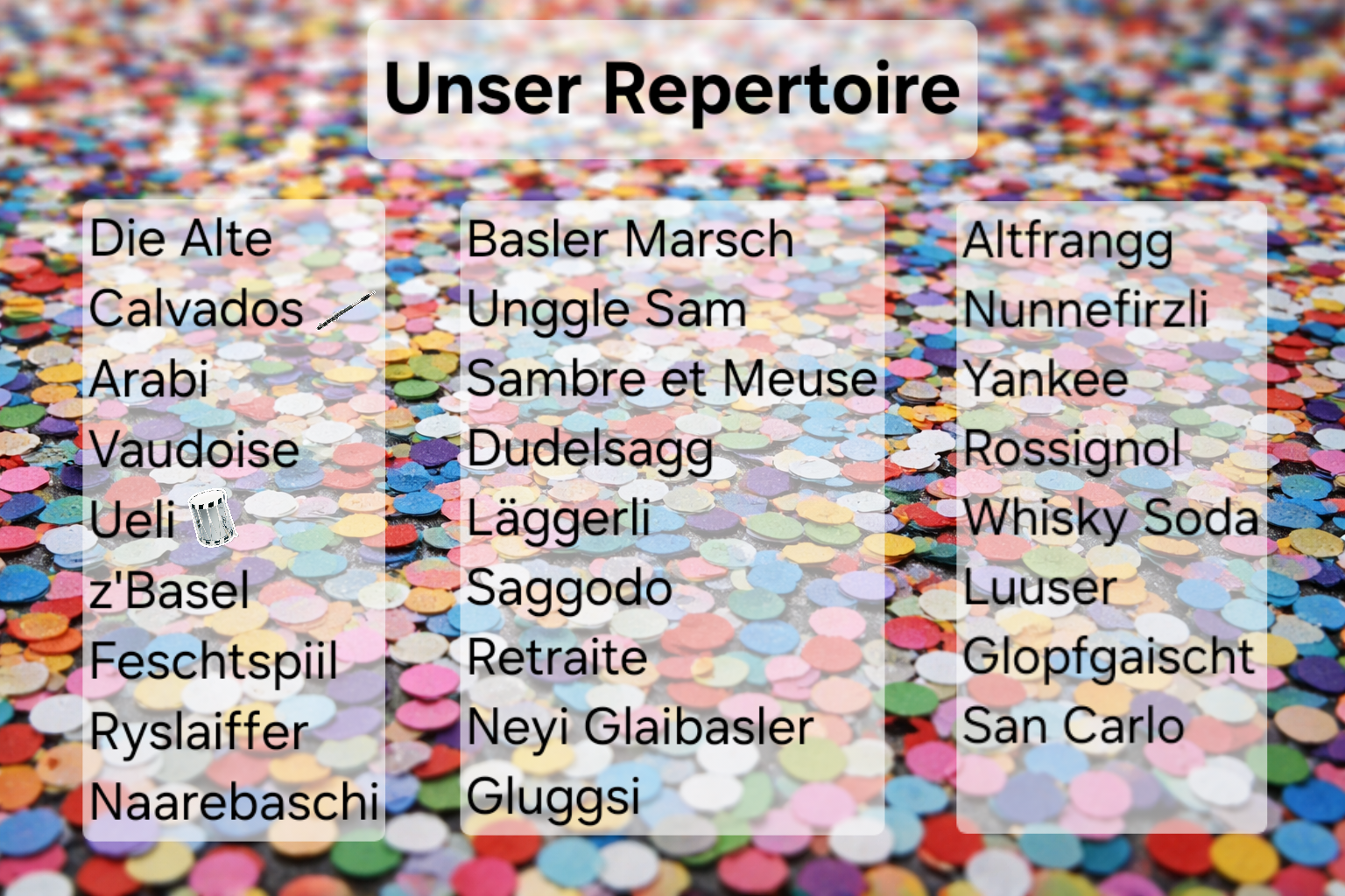 Mir sinn e bunte Huffe, hänn e eigene Glyggekäller, dört verbringe mir gueti Zytte, mit gmeinsame Iebigsstunde, baschtle, Fasnachtsvorbereitige und em Gniesse vo mängg witere gsellige Aläss.